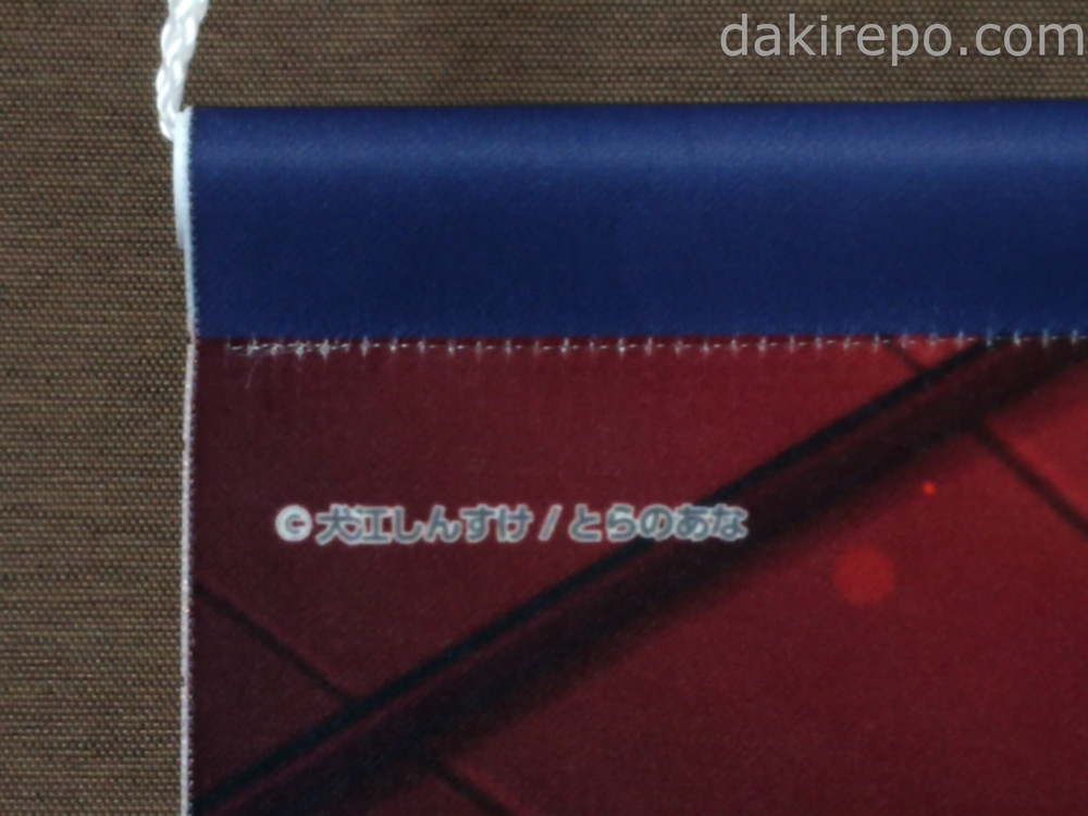 タペストリーの製造メーカーは不明です。材質は一般的な厚みのダブルスエードの布で引っ張っても伸びにくく強度があります。縁はほつれ防止の加工がされています。