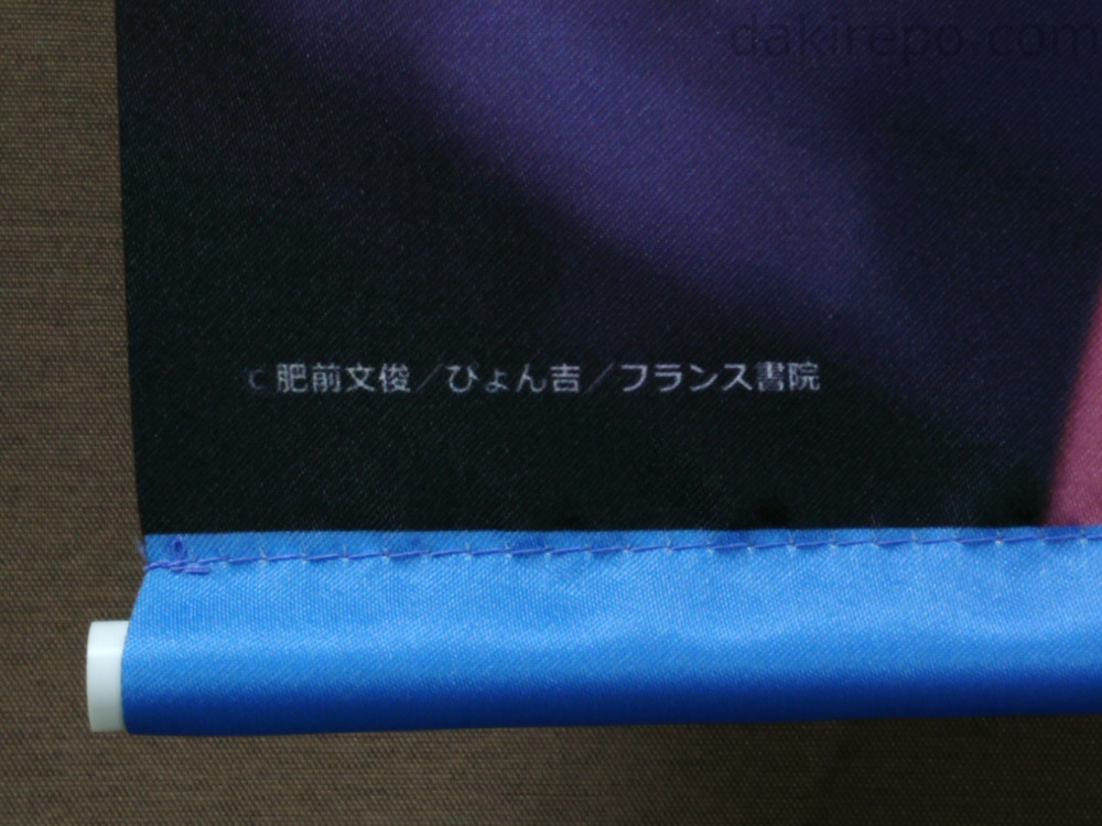 タペストリーの製造メーカーは不明です。材質は特典に使われる薄いポリエステル製の布です。柔軟性は無く固いです。。
