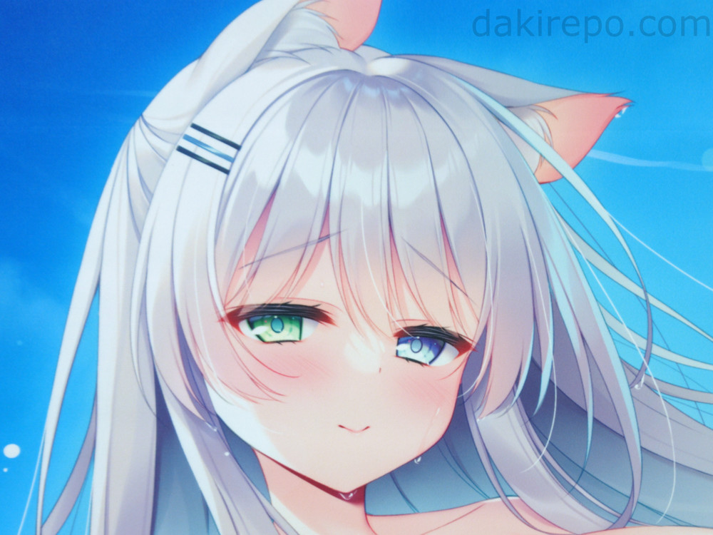 全裸で海水浴中のケモミミ少女のイラストです。