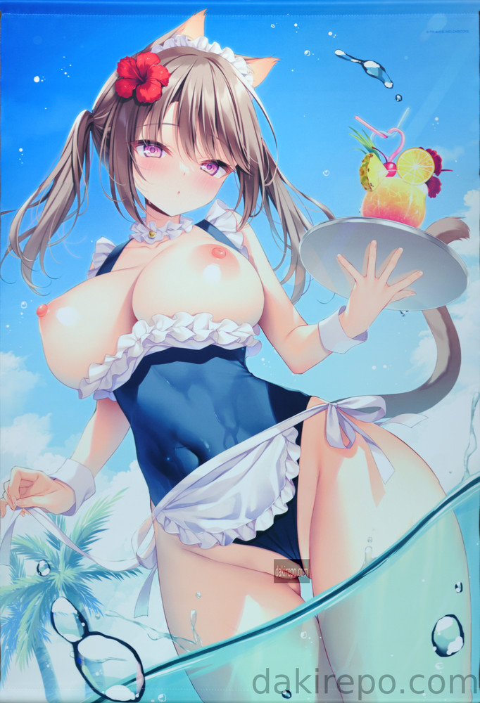 競泳水着型のメイド服を着て、おっぱいとアソコが丸出しのケモミミ女の子のイラストです。
